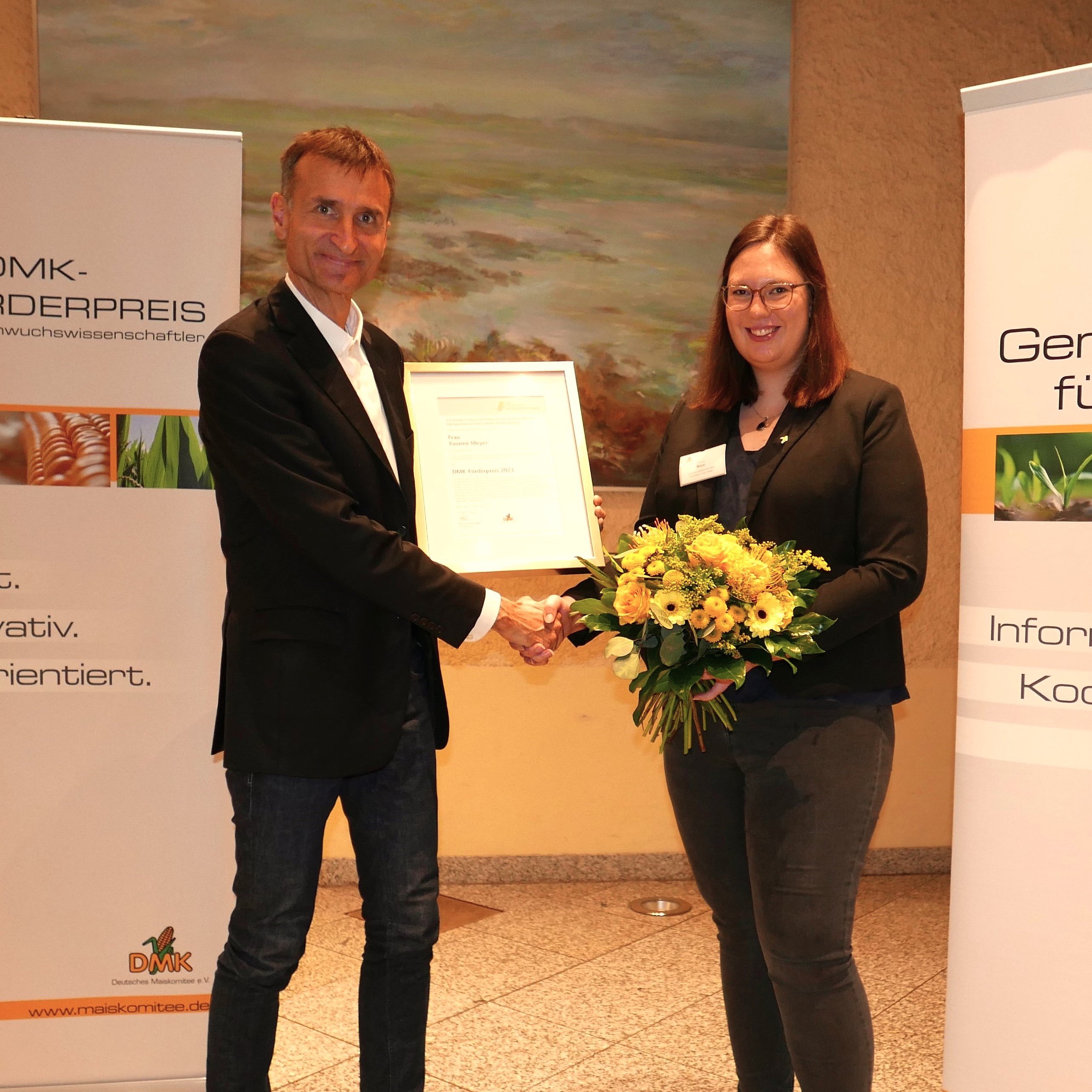 Frau Yvonne Meyer wurde für ihre Masterarbeit „Einfluss zweier Silomaissorten mit unterschiedlicher Restpflanzenverdaulichkeit auf Leistungsparameter von hochleistenden Milchkühen“ der DMK-Förderpreis für Nachwuchswissenschaftler 2023 verliehen.