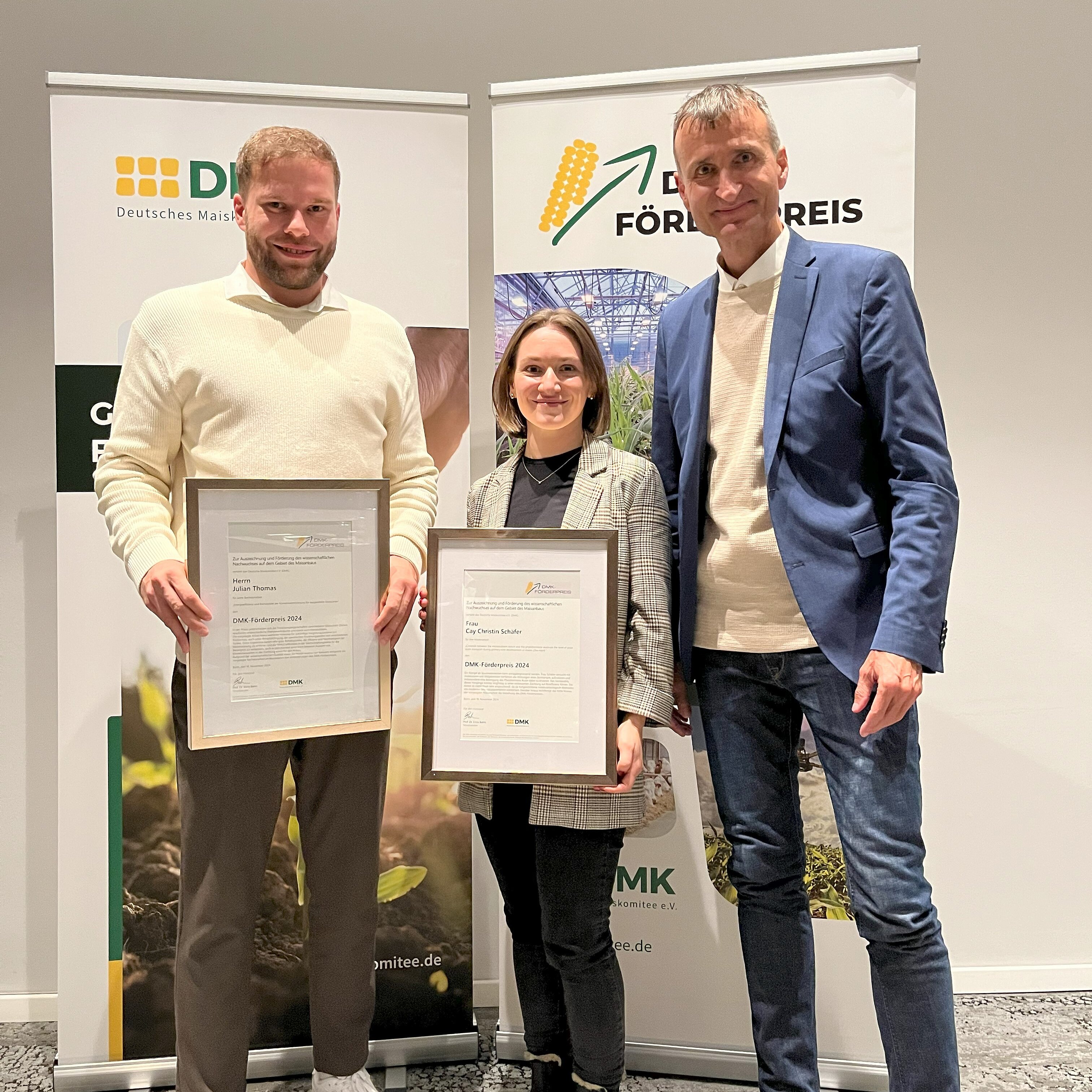 Herrn Julian Thomas wurde für seine Bachelorarbeit "Energieeffizienz und Rentabilität der Körnermaistrocknung für ausgewählte Maissorten" der DMK-Förderpreis für Nachwuchswissenschaftler 2024 verliehen.