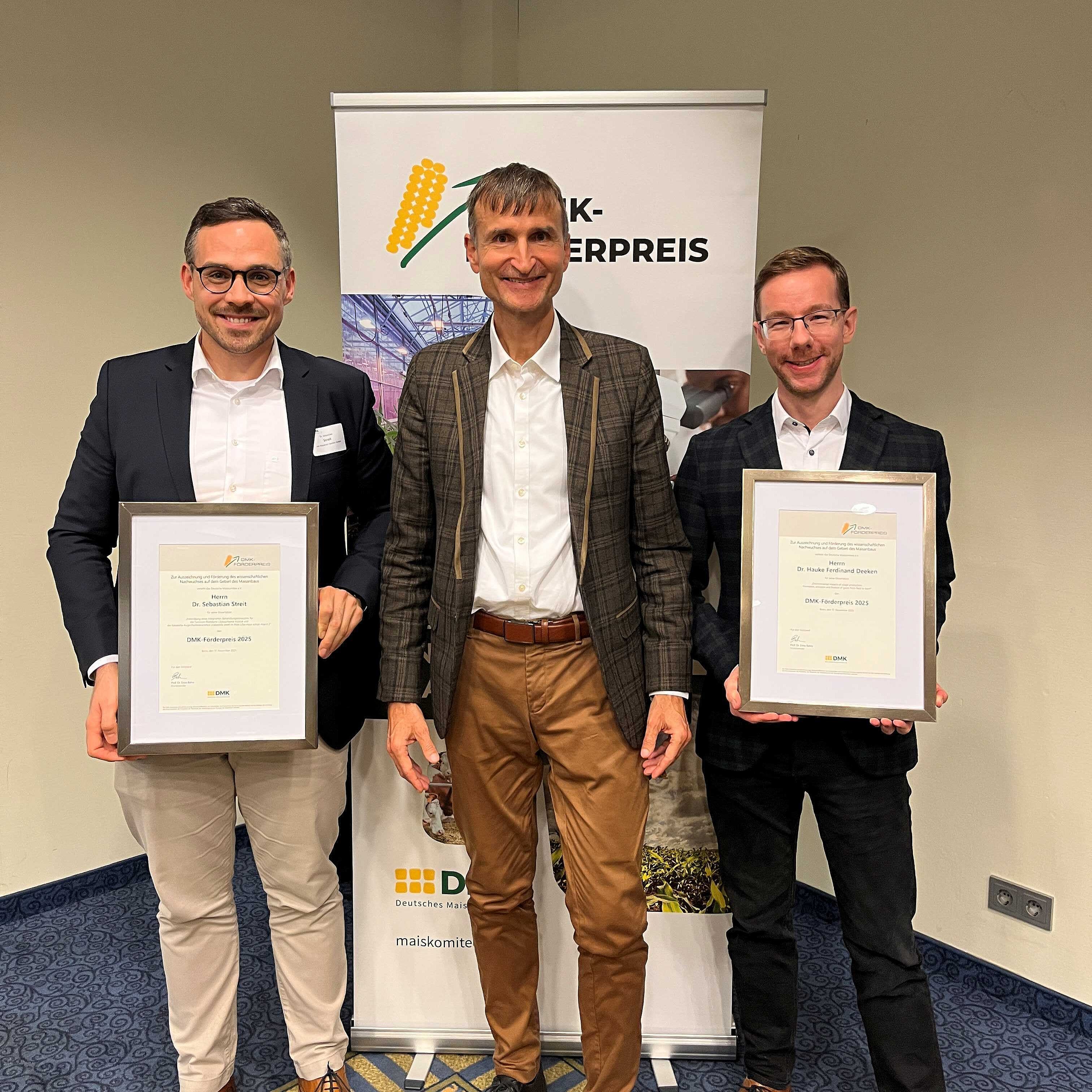 Die Dissertation von Dr. Sebastian Streit mit den Titel „Entwicklung eines integrierten Behandlungskonzeptes für die Turcicum-Blattdürre (Setosphaeria trucica) und die Kabatiella-Augenfleckenkrankheit (Kabatiella zeae) im Mais (Zea mays subsp. mays L.)“ wurde mit dem DMK-Förderpreis 2025 ausgezeichnet.